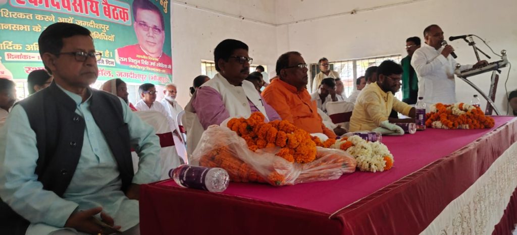 जगदीशपुर – जगदीशपुर नगर के टाऊन हॉल में शनिवार को भोजपुर बक्सर विधान परिषद चुनाव को लेकर एकदिवसीय बैठक का आयोजन हुआ। जिसकी अध्यक्षता भाकपा माले के नगर सचिव गणेश कुशवाहा तथा संचालन राजद प्रखण्ड अध्यक्ष भोला खां ने किया। इस दौरान बैठक में उपस्थित पीरो व जगदीशपुर के जनप्रतिनिधियों से वक्ताओं द्वारा महागठबंधन समर्थित आरा बक्सर स्थानीय निकाय के प्रत्याशी अनिल सम्राट को वोट देकर चुनाव जिताने की अपील की गई।